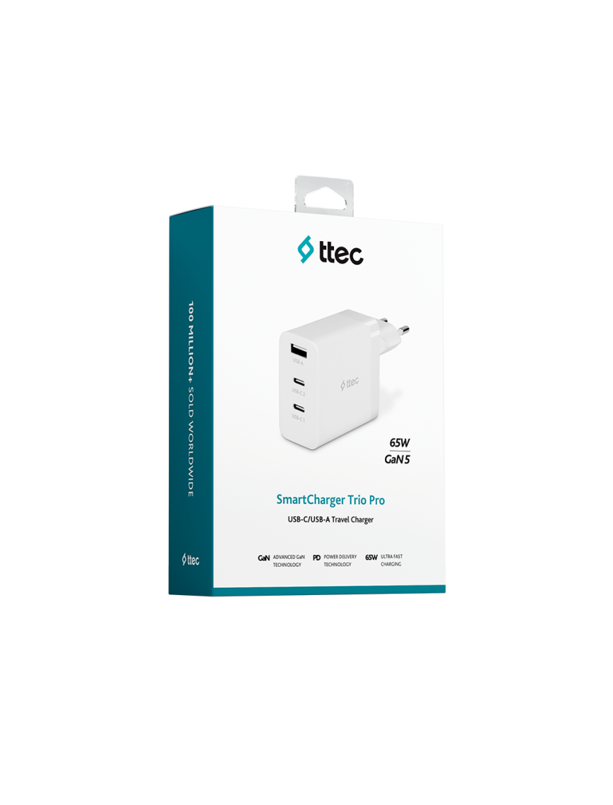ttec SmartCharger Trio GAN 65W PD Seyahat Hızlı Şarj Aleti 2 USB-C+USB-A Beyaz