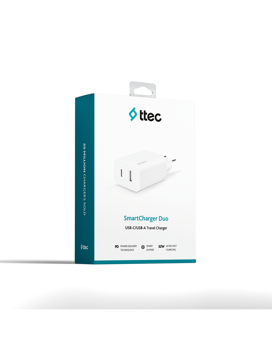 ttec SmartCharger Duo PD 32W Seyahat Hızlı Şarj Aleti USB-C + USB-A Beyaz